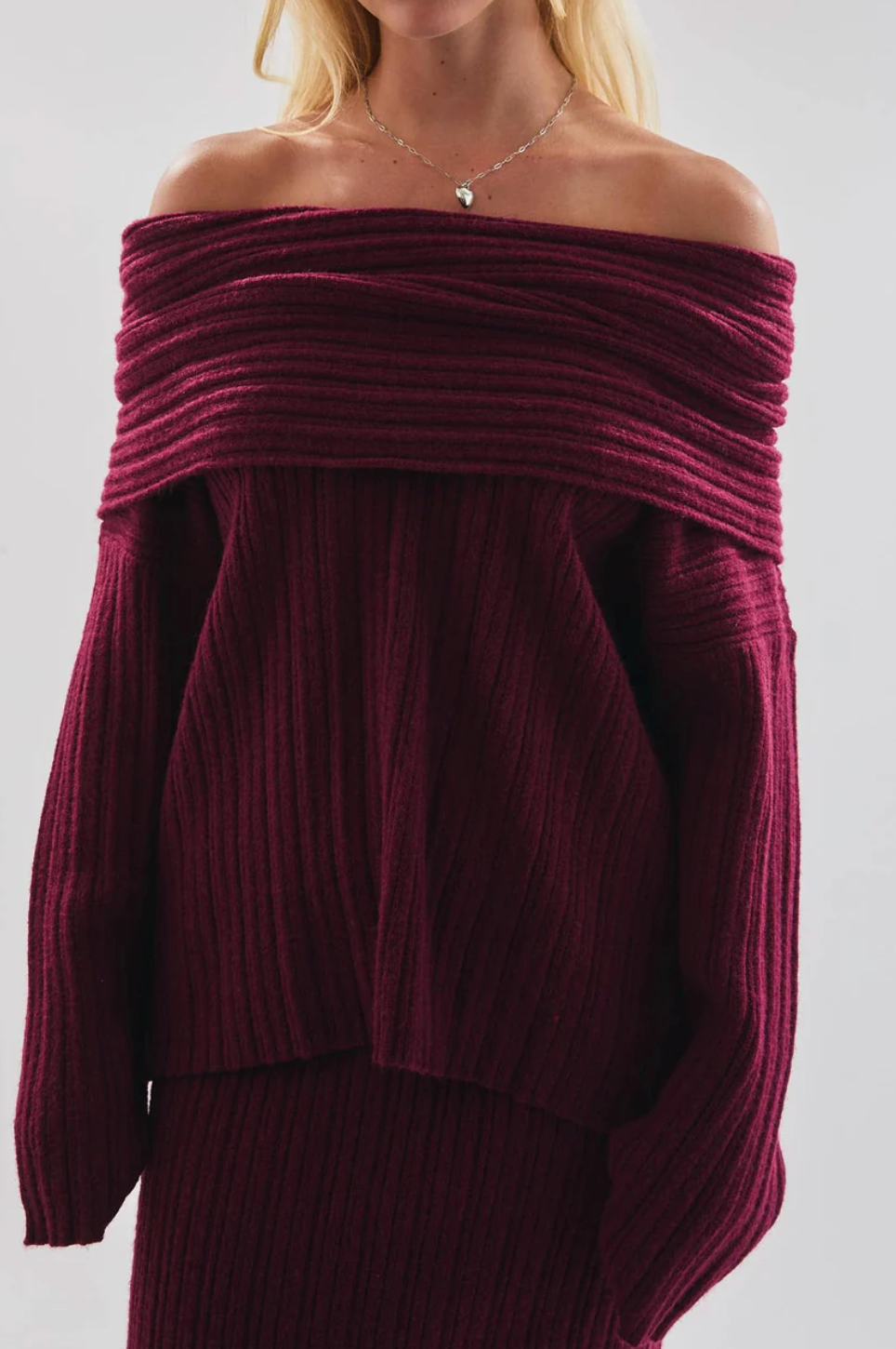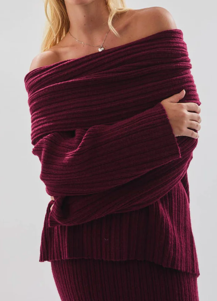 Charlize Off Shoulder Ribbed Sweater in Ruby